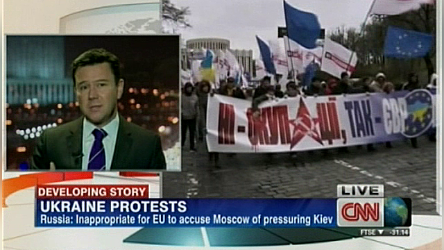 ФИЛ БЛЭК, корреспондент CNN: Российская точка зрения заключается в том, что это решение Украина принимает самостоятельно, как суверенная страна. Как мне кажется, эту точку зрения в Брюсселе воспринимают, в общем, скептически. В частности, высокопоставленные чиновники ЕС, по существу, обвинили Россию в том, что она угрозами заставила Украину дать задний ход в отношении этих соглашений с Евросоюзом. Россия, в свою очередь, утверждает, что обвинения подобного рода неуместны, поскольку Россия считает Украину независимым государством.