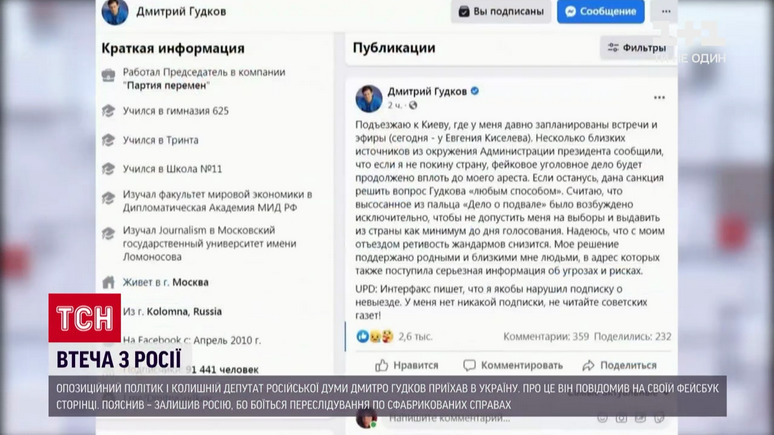 Российский оппозиционный политик и бывший депутат Госдумы Дмитрий Гудков приехал на Украину. Как передаёт «1+1», по словам Гудкова, ему пришлось бежать из России, поскольку он боится преследований по сфабрикованным делам. В дальнейшем он планирует отправится в Болгарию, где сейчас находятся его родственники.