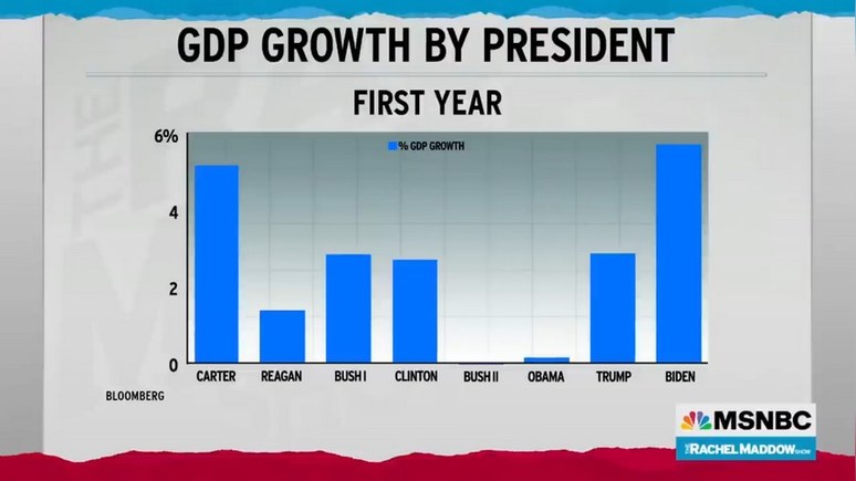 Несмотря на продолжающуюся пандемию, администрация Байдена сейчас курирует историческое выздоровление экономики. Заявления на выплаты по безработице сейчас на рекордно низкой отметке за 52 года. В первый год президентства Байдена число рабочих мест выросло значительнее, чем в первый год любого президента со времён Джимми Картера. А по прогнозам Bloomberg, президент Байден также добьётся самого большого расширения экономики США за первый год президентского срока, считая с 1970-х. Это потрясающе!