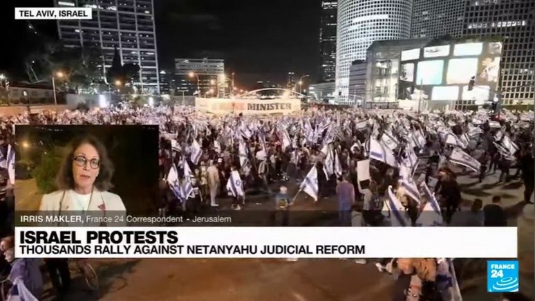 ИРРИС МАКЛЕР, корреспондент France 24: И происходит такое не только в Тель-Авиве, из которого уже много недель приходят снимки с десятками тысяч протестующих — протесты идут по всей стране. Некоторые акции небольшие, какие-то — средние, а другие — крупные, но все они не останавливаются, не прекращаются.