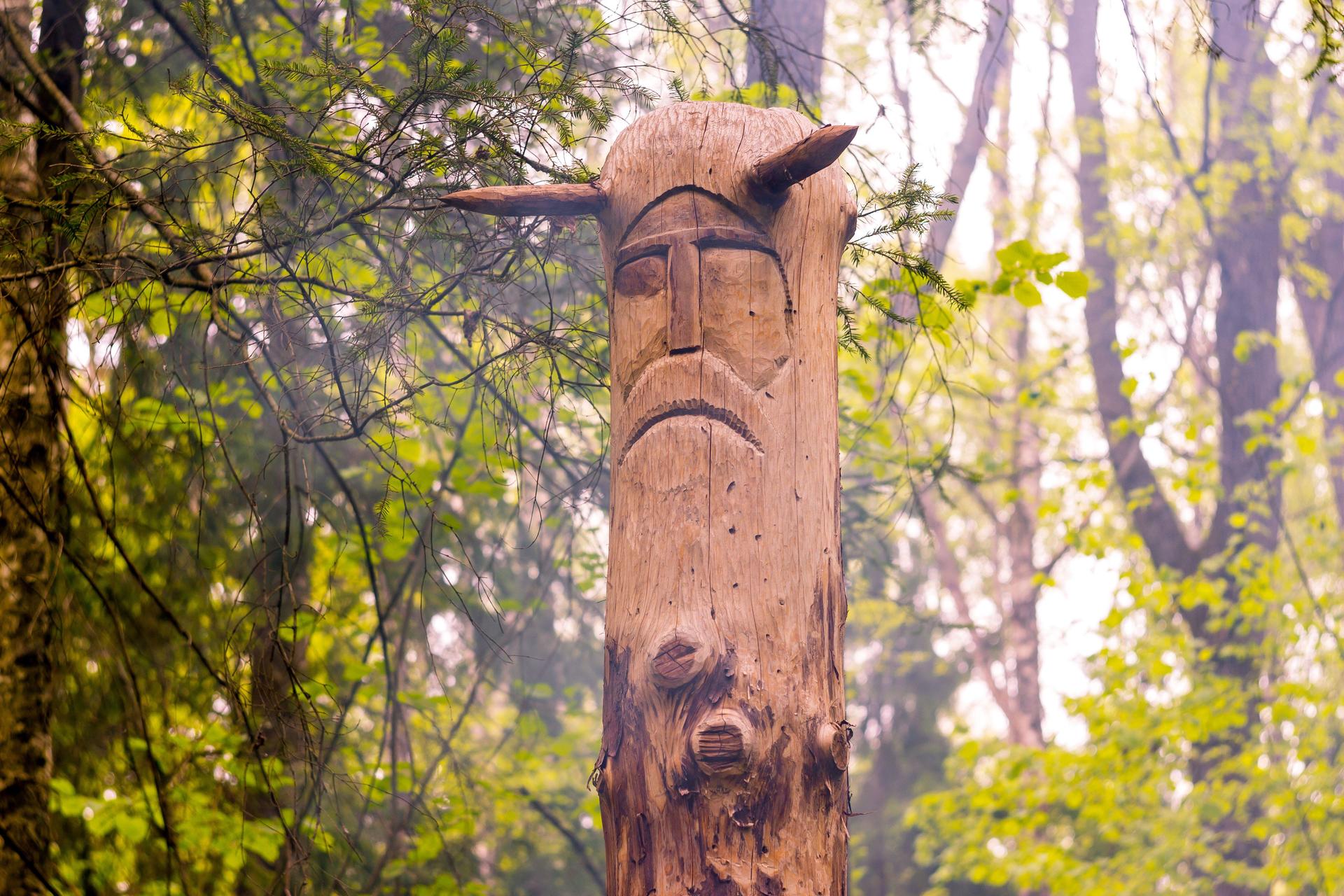 - Изображение славянского божества Велеса, вырезанное на стволе дерева на неоязыческом капище в лесу. Калужская область, Россия.