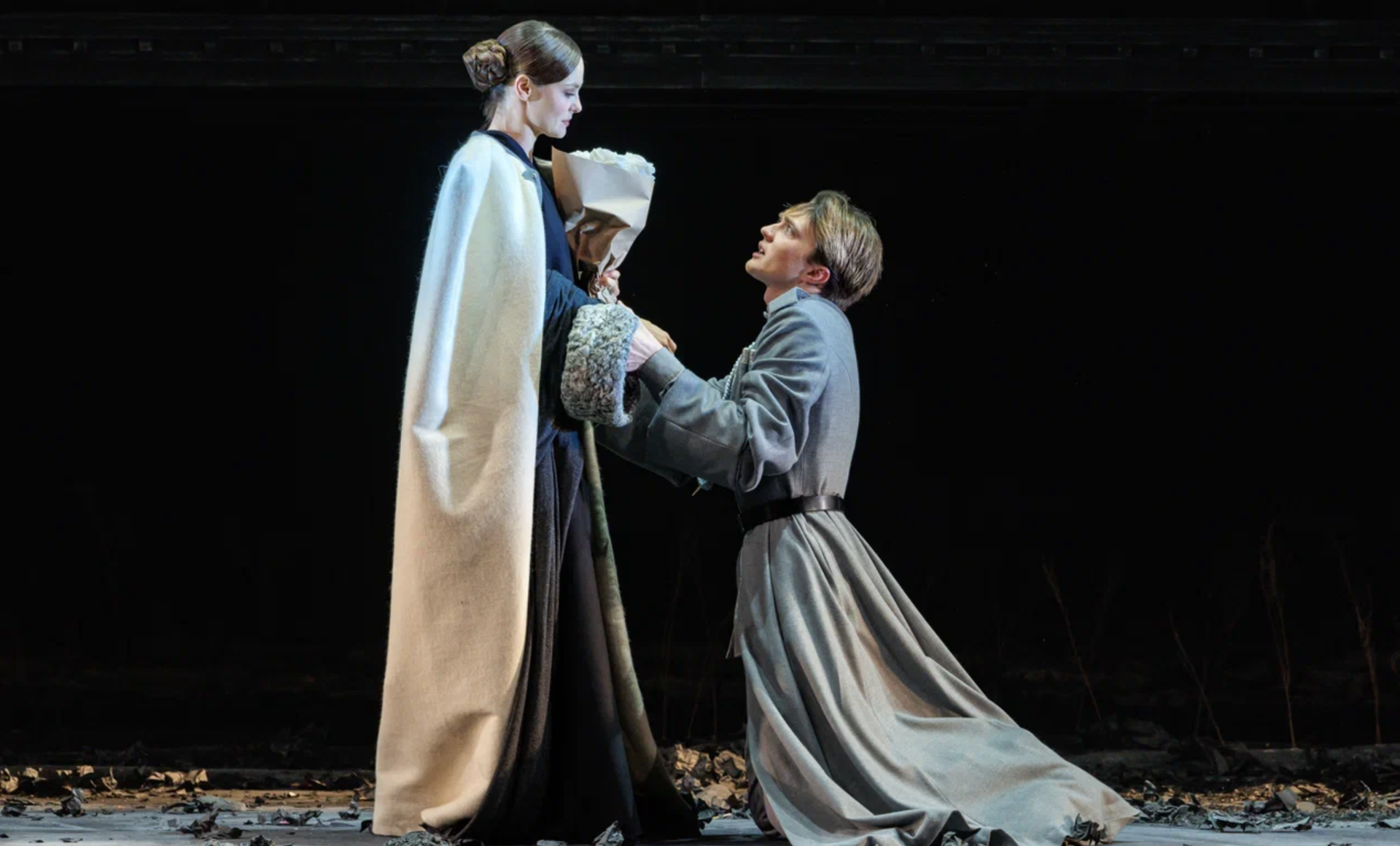- Актриса Ангелина Стречина в роли Елены Тальберг и актёр Иван Трушин в роли Леонида Шервинского. Сцена из спектакля Малого театра «Белая гвардия»