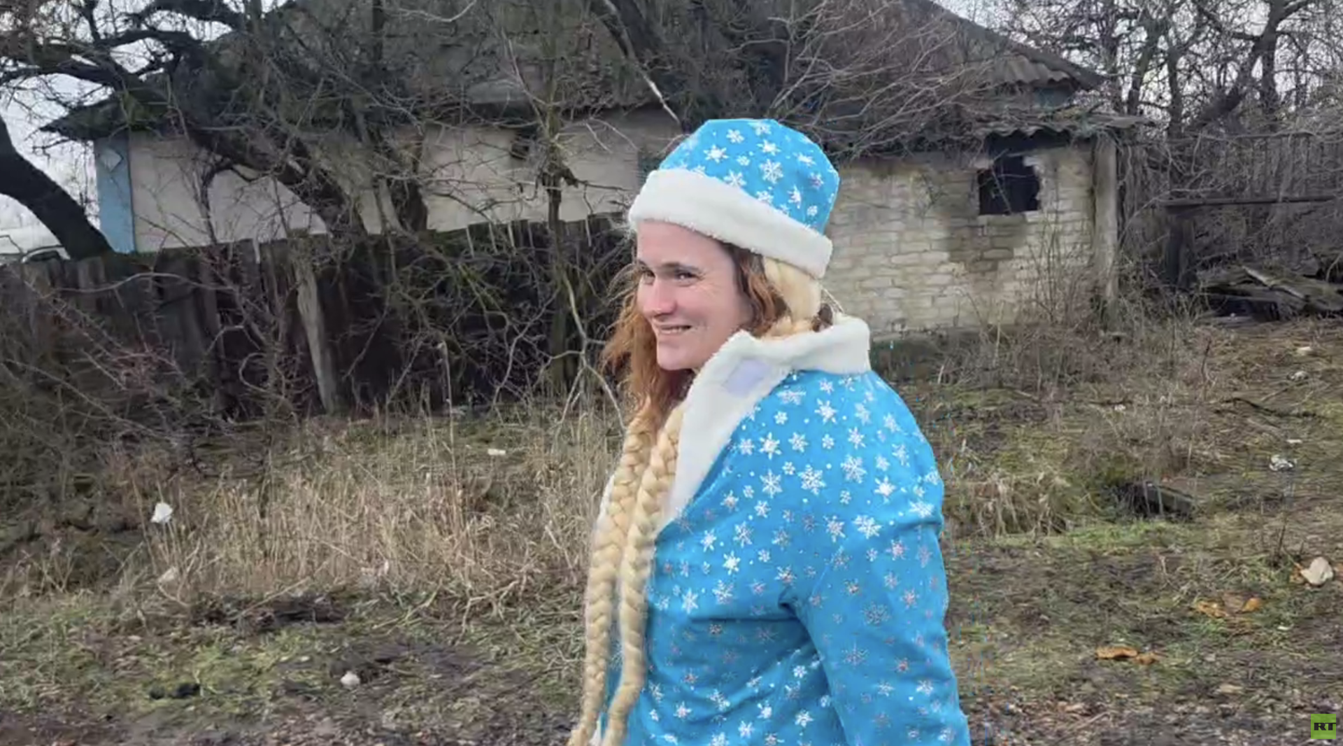 Кончается февраль. В прифронтовом посёлке Кураховка — грязь, плюсовая температура и размытые дороги. Я в костюме Снегурочки, из-под которого выглядывает мультикам, прыгаю по лужам улицы с частными одноэтажными домами. Впереди меня — Дед Мороз, не менее странный для конца зимы персонаж. Военная машина на перекрёстке выше останавливается, бойцы с хохотом начинают нас снимать.