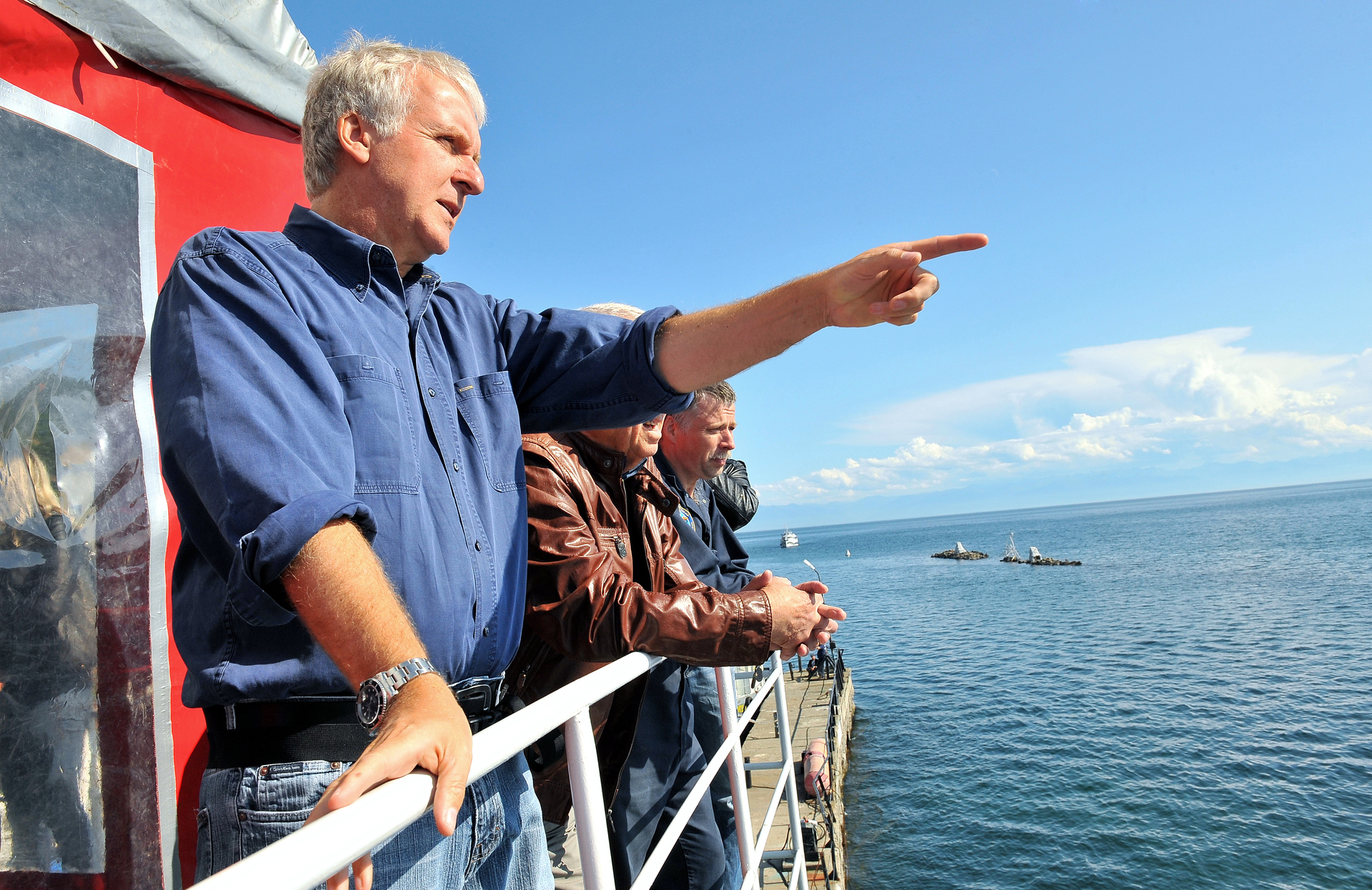 - Американский кинорежиссёр Джеймс Кэмерон в посёлке Листвянка на озере Байкал, где базируются глубоководные аппараты «Мир-1» и «Мир-2».