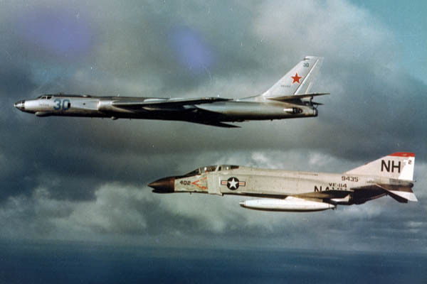 - Ту-16 в сопровождении истребителя F-4 «Фантом» ВМС США, Тихий океан, 1963 год