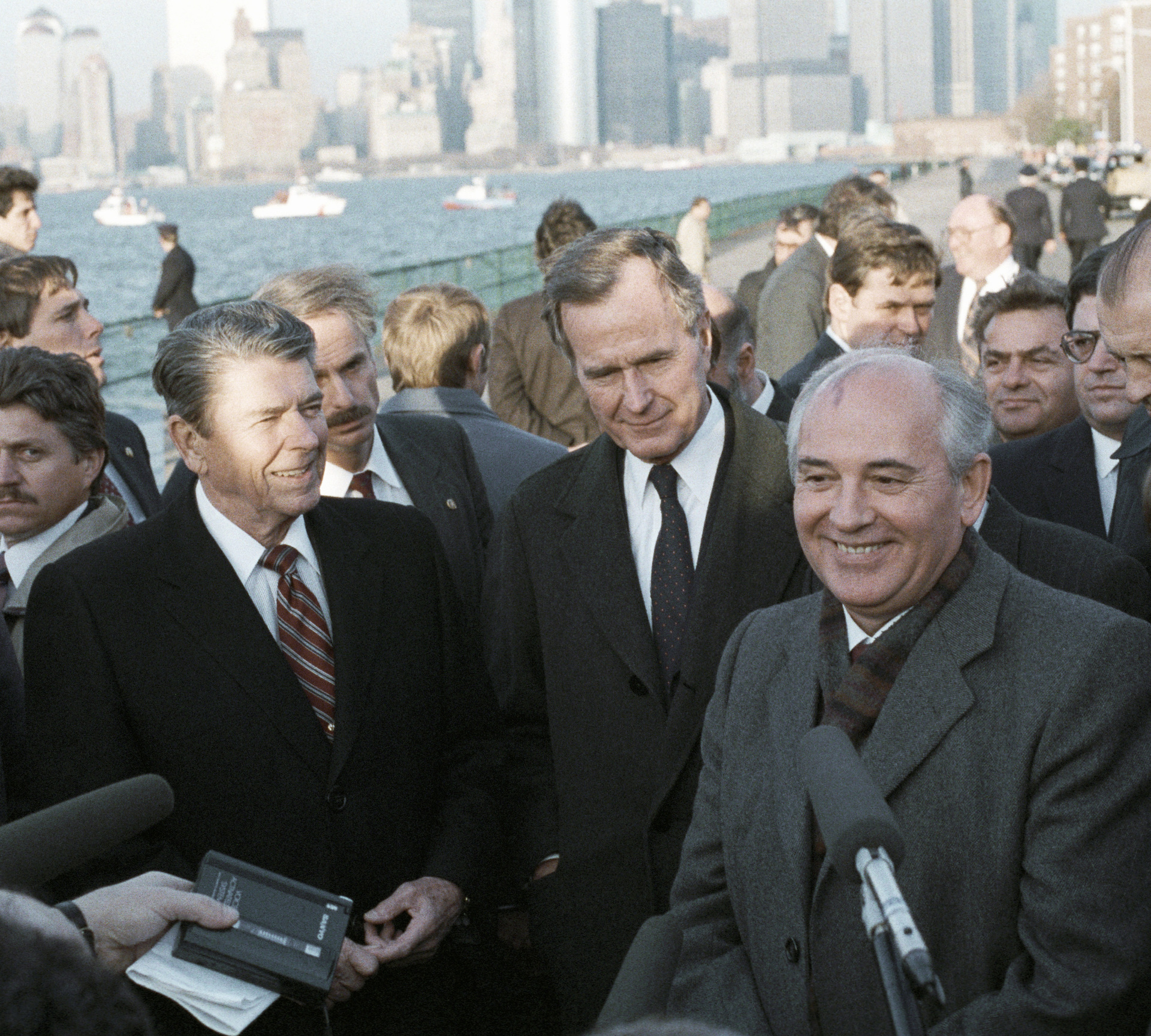 - Генеральный секретарь ЦК КПСС Михаил Горбачёв, президент США Рональд Рейган и вице-президент США Джордж Буш дают интервью на улице Нью-Йорка во время визита Горбачёва в США