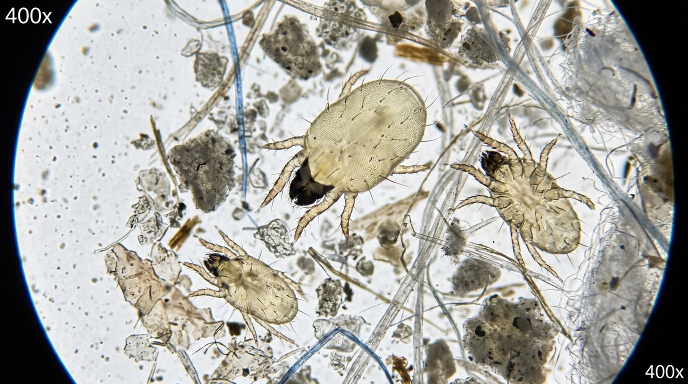 Кроме того, в домашней пыли живут пылевые клещи — микроскопические паукообразные существа. Их нельзя увидеть невооружённым глазом, поскольку размер одной особи не более 0,5 мм. При этом в квартире их может быть очень много. В зависимости от вида клещей на 1 г пыли может приходиться 100 или даже 500 особей.