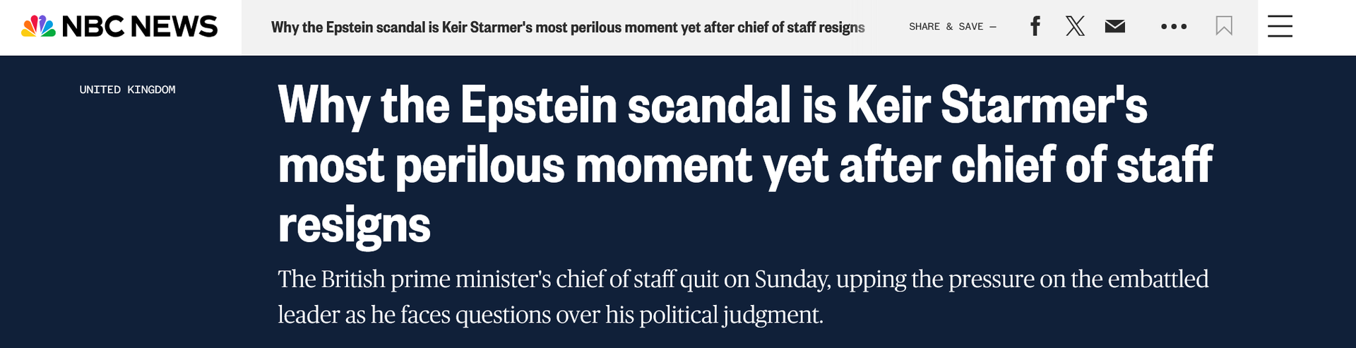 Западные СМИ пишут о «панике» в британском правительстве в связи с публикацией материалов по делу миллиардера Джеффри Эпштейна, осуждённого за преступления сексуального характера и умершего в нью-йоркской тюрьме. Как сообщает NBC, в центре скандала оказался премьер-министр Кир Стармер, назначивший друга Эпштейна, Питера Мандельсона, послом в США. Это решение стоило должности ближайшему советнику премьера — Моргану Максуини, передаёт CNN. Многие считали Максуини самой влиятельной фигурой на Даунинг-стрит, отмечают The Guardian и The Independent. Теперь, по оценкам Bloomberg, падение Стармера представляется неизбежным.