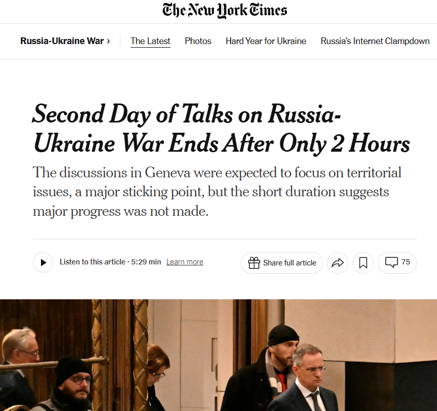 Западные СМИ отреагировали на итоги переговоров в Женеве по вопросу урегулирования конфликта на Украине серией материалов. Как отмечает The New York Times (NYT) в публикации по итогам двухдневных контактов сторон, вопрос территорий — одно из главных затруднений на пути к мирному соглашению.