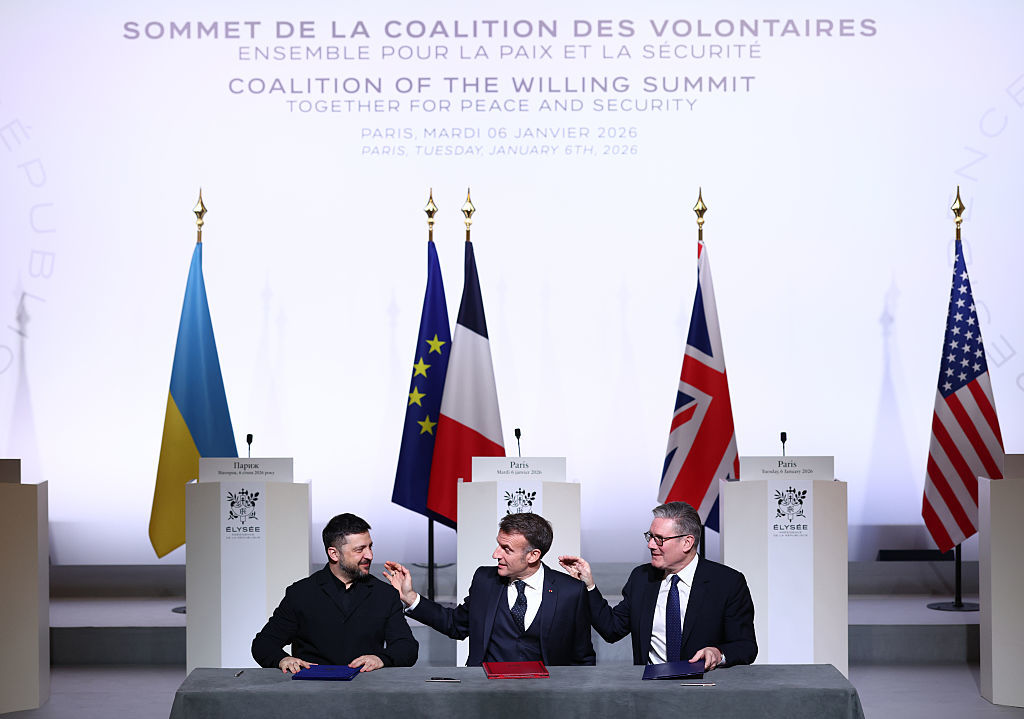 - Президент Украины Владимир Зеленский, президент Франции Эммануэль Макрон и премьер-министр Великобритании Кир Стармер подписывают Декларацию о намерениях разместить войска на Украине в случае мирного соглашения во время встречи «Коалиции желающих» в Елисейском дворце 6 января 2026 года в Париже