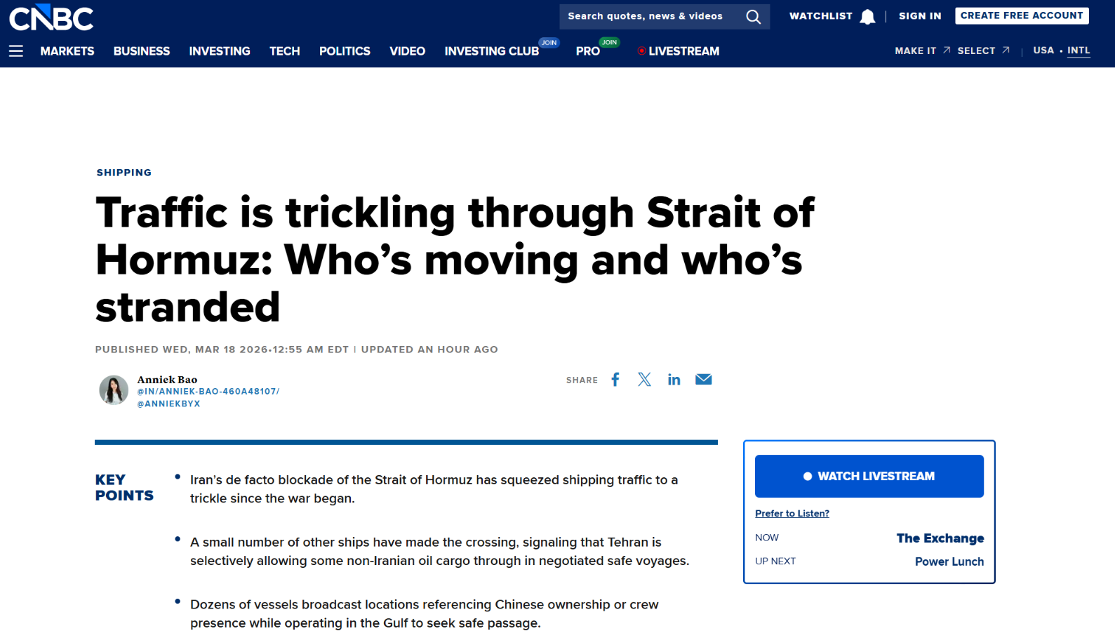 По данным CNBC, Иран «сохраняет жёсткий контроль» над проливом, однако в ряде случаев даёт зелёный свет иностранным танкерам.