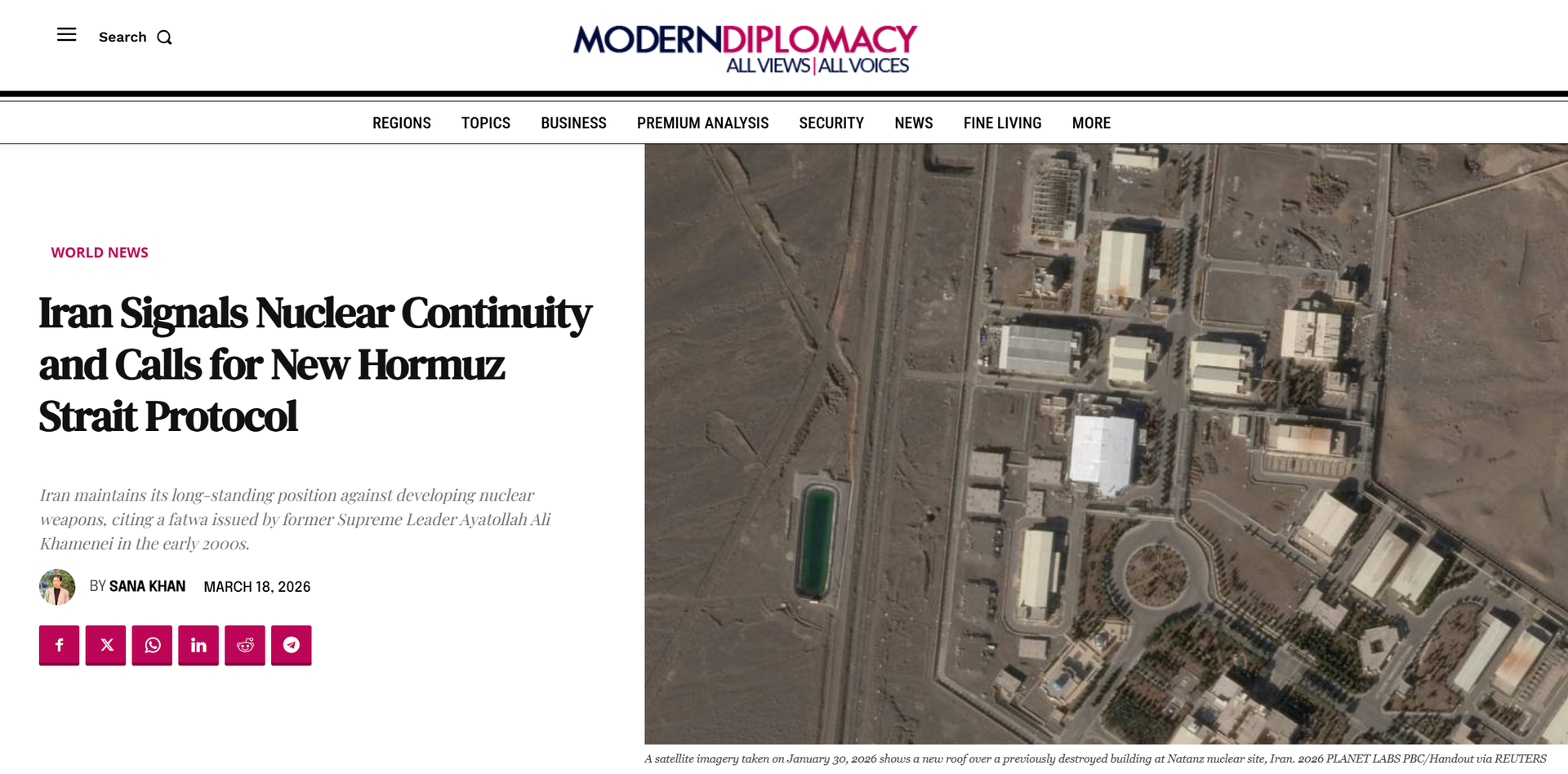 «Подтверждение фетвы о ядерном (оружии. — RT) демонстрирует преемственность и сигнализирует международным наблюдателям о том, что его позиция по ядерному вопросу носит оборонительный характер. В то же время призывы к заключению нового протокола по Ормузскому проливу направлены на утверждение влияния Ирана на важнейший для мировой энергетики маршрут, что представляет собой долгосрочную проблему для международного судоходства и дипломатии», — говорится в материале.