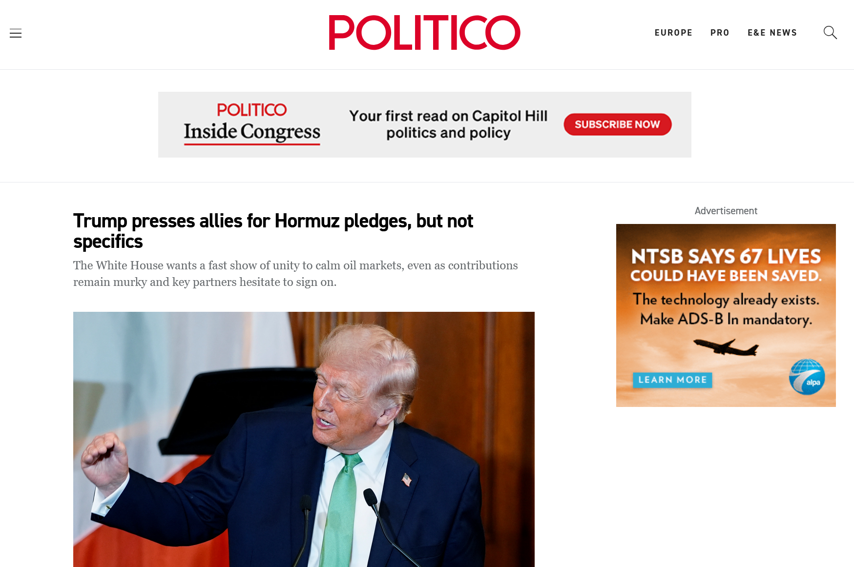 По данным Politico, представители США «упрашивают» союзников помочь обезопасить Ормузский пролив и в частном порядке заверяют их, что президенту Дональду Трампу достаточно заявлений на высоком уровне, поскольку это «способствует успокоению финансовых рынков».