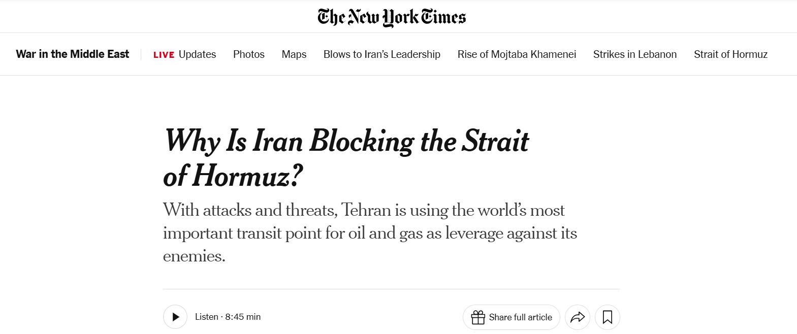 Администрация США обещает «сорвать попытки» Ирана перекрыть пролив, отмечает NYT, «но военная история и недавние события говорят о том, что это будет трудная задача».