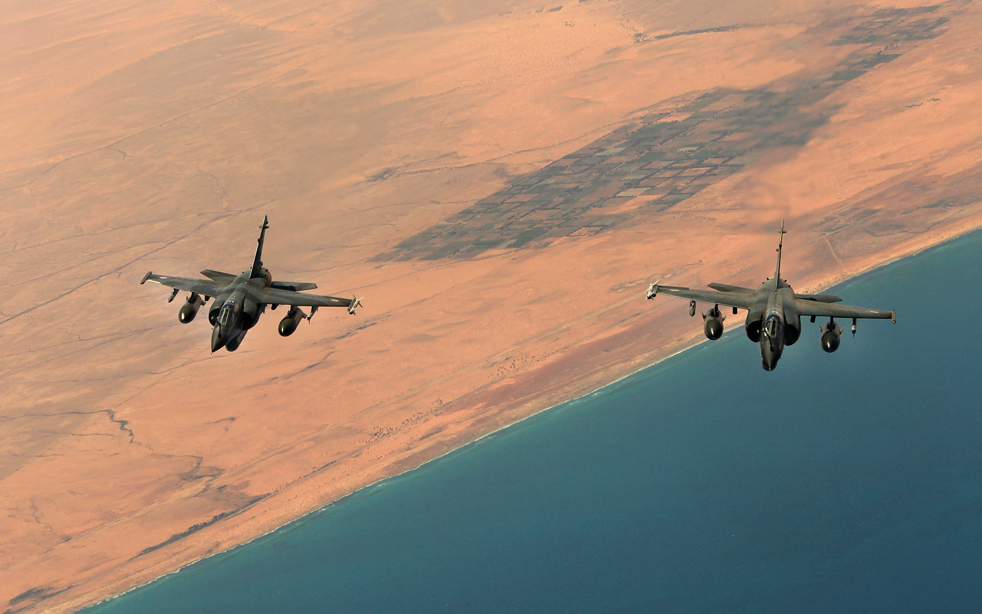 - Два французских истребителя Mirage F-1 пролетают над ливийским побережьем во время воздушной операции «Харматтан» 9 апреля 2011 года вблизи Ливии.
