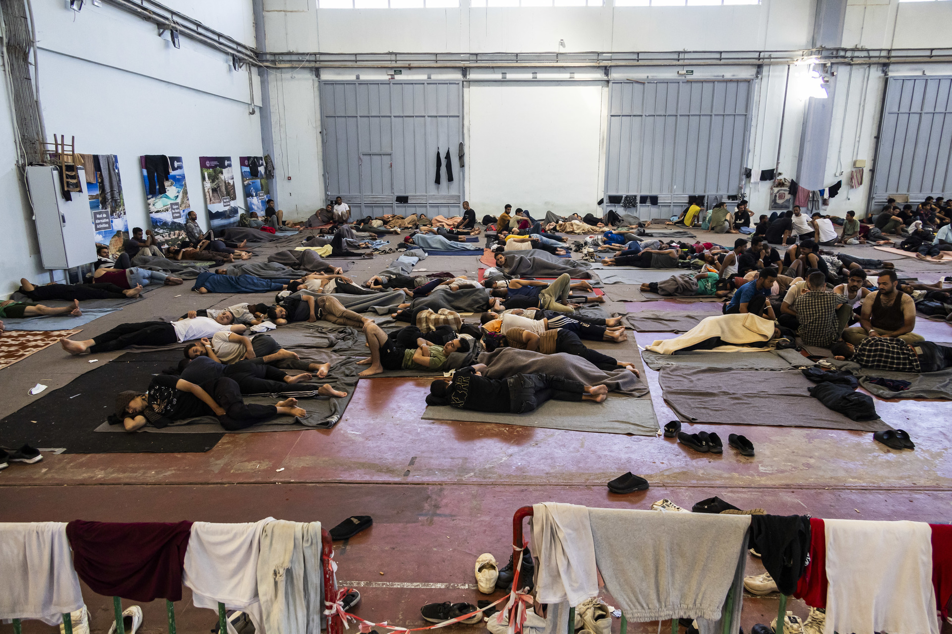 - Ливийские беженцы спят на полу во временном пункте размещения в Греции, 2025 год.