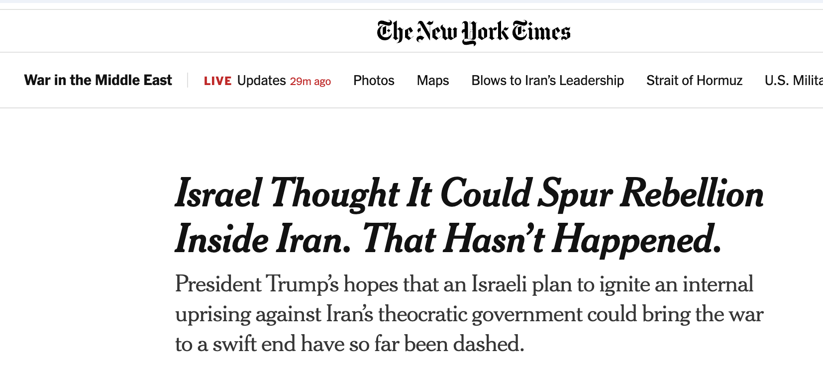 «В преддверии войны Нетаньяху ссылался на оптимизм МОССАДа относительно возможности иранского восстания, чтобы убедить Трампа в том, что крах иранского правительства является реалистичной целью», — говорится в статье.