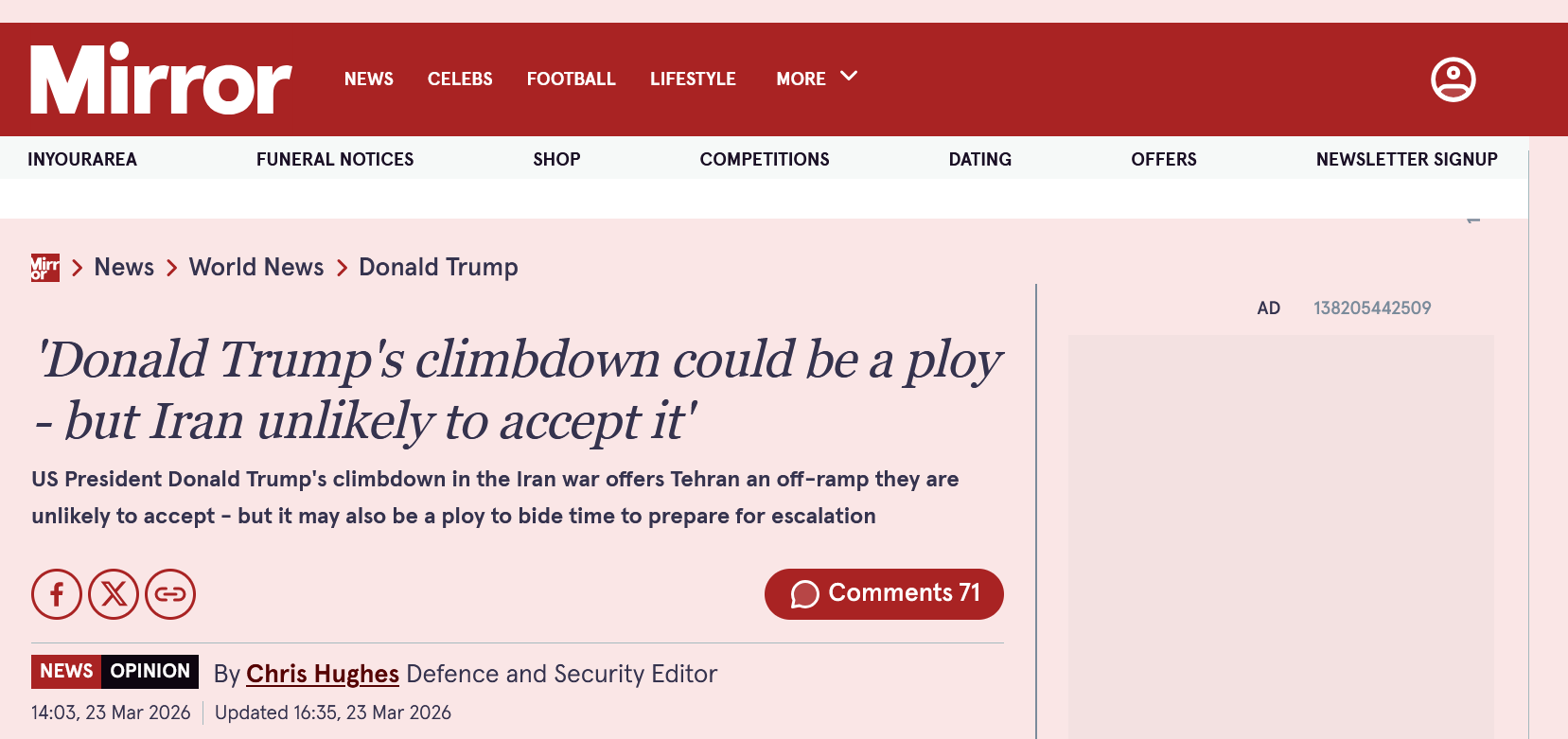 В то же время британский таблоид The Daily Mirror пишет, что заявления Белого дома о переговорах могут быть «уловкой», на которую Иран вряд ли попадётся.
