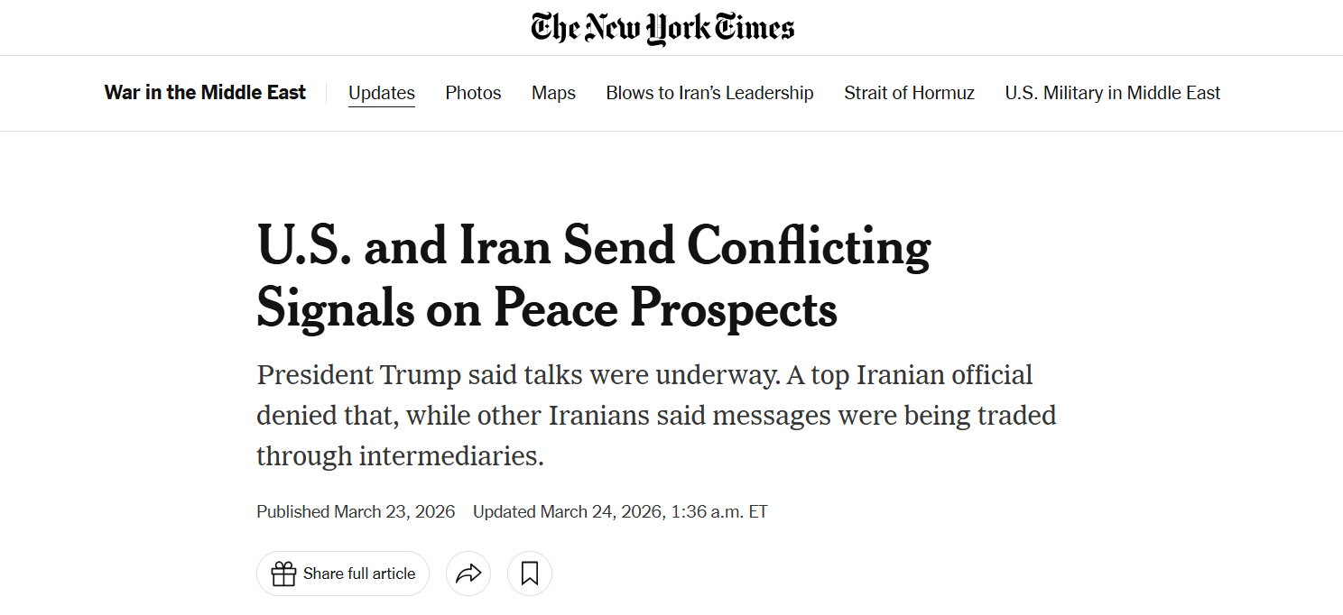 Как отмечает The New York Times (NYT), противоречивые сигналы, поступившие в понедельник, 23 марта, из Соединённых Штатов, Ирана и Израиля, «оставили неясную картину»: нет никакой уверенности в том, что переговоры действительно ведутся, перспективы скорого окончания ближневосточного конфликта также под вопросом.