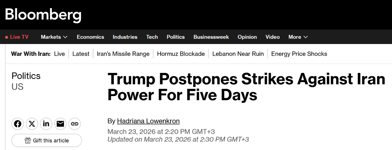 Со своей стороны, немецкая газета Die Welt пишет, что решение Белого дома отложить удары по иранским электростанциям «показывает, что Трамп и его администрация в очередной раз переоценили свои стратегические возможности в войне с Ираном».