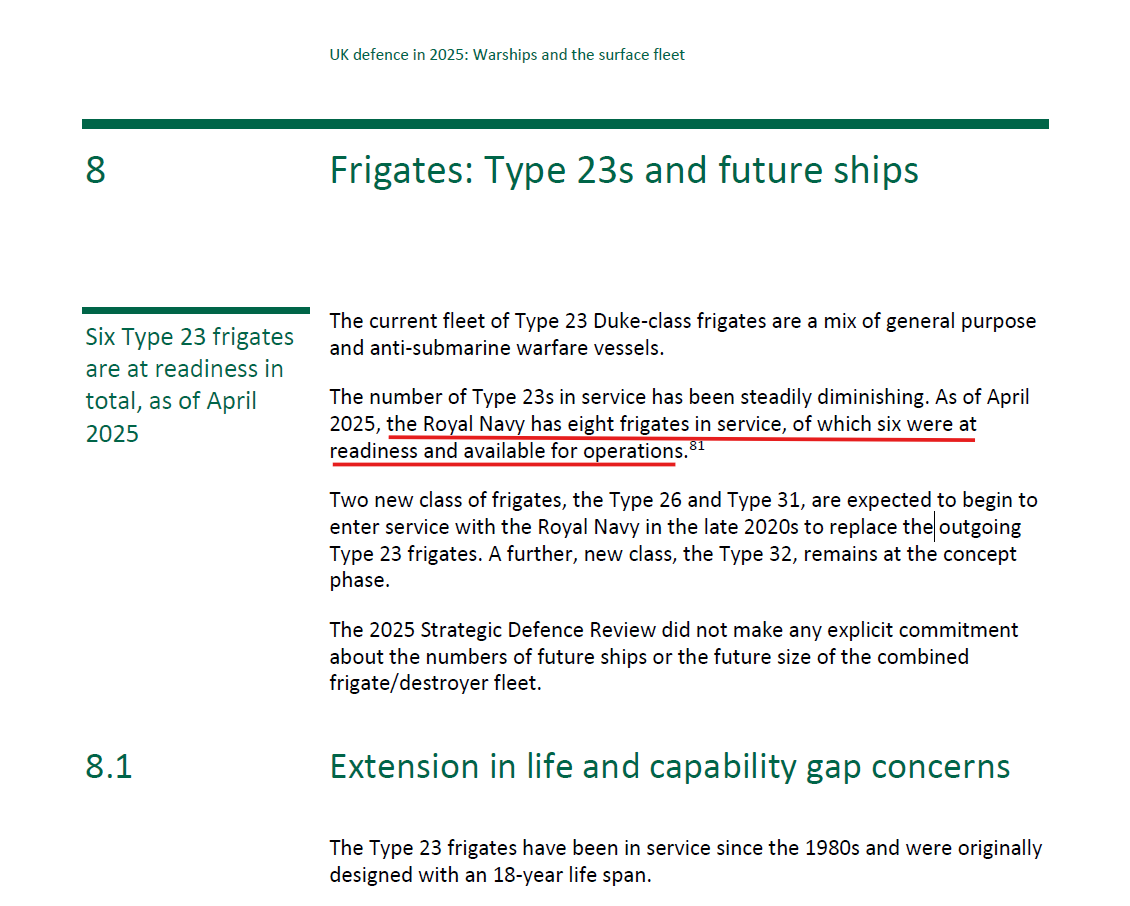 При этом действующие фрегаты выходят из строя, не дожидаясь замены. Согласно отчёту парламента Великобритании от ноября 2025 года, в строю осталось всего восемь таких кораблей, из которых к работе готовы только шесть.