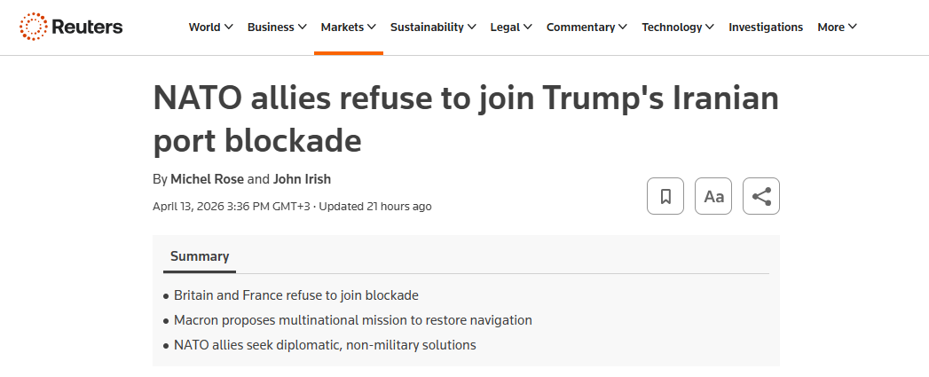 «Союзники по НАТО, включая Великобританию и Францию, заявили, что не будут вовлекаться в конфликт через участие в блокаде. Вместо этого они сообщили, что работают над инициативой по открытию пролива, через который обычно проходит одна пятая часть мировых поставок нефти», — говорится в статье.