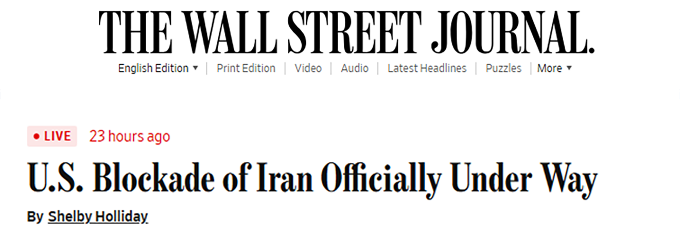 «В понедельник США приступили к блокаде Ормузского пролива после провала состоявшихся на выходных мирных переговоров с Ираном, создавая опасность очередного потрясения для мировой экономики, измученной неделями войны», — пишет WSJ.