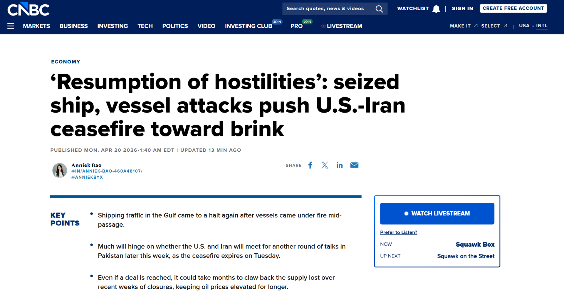 CNBC напоминает, что после того, как в пятницу Иран объявил Ормузский пролив «полностью открытым для коммерческих перевозок», цены на нефть упали более чем на 10%, а уже к субботе «надежды на полное открытие (торгового пути. — RT) быстро развеялись»: из-за отказа Вашингтона прекратить военно-морскую блокаду иранских портов Тегеран вновь взял пролив под контроль. А после захвата иранского судна «в понедельник фьючерсы на американские акции упали, в то время как цены на сырую нефть выросли, поскольку США и Иран балансировали на грани возобновления конфликта», говорится в статье.