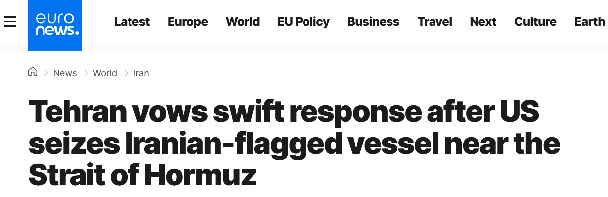 - «Тегеран обещает быстрый ответ, после того как судно под иранским флагом было захвачено США близ Ормузского пролива»