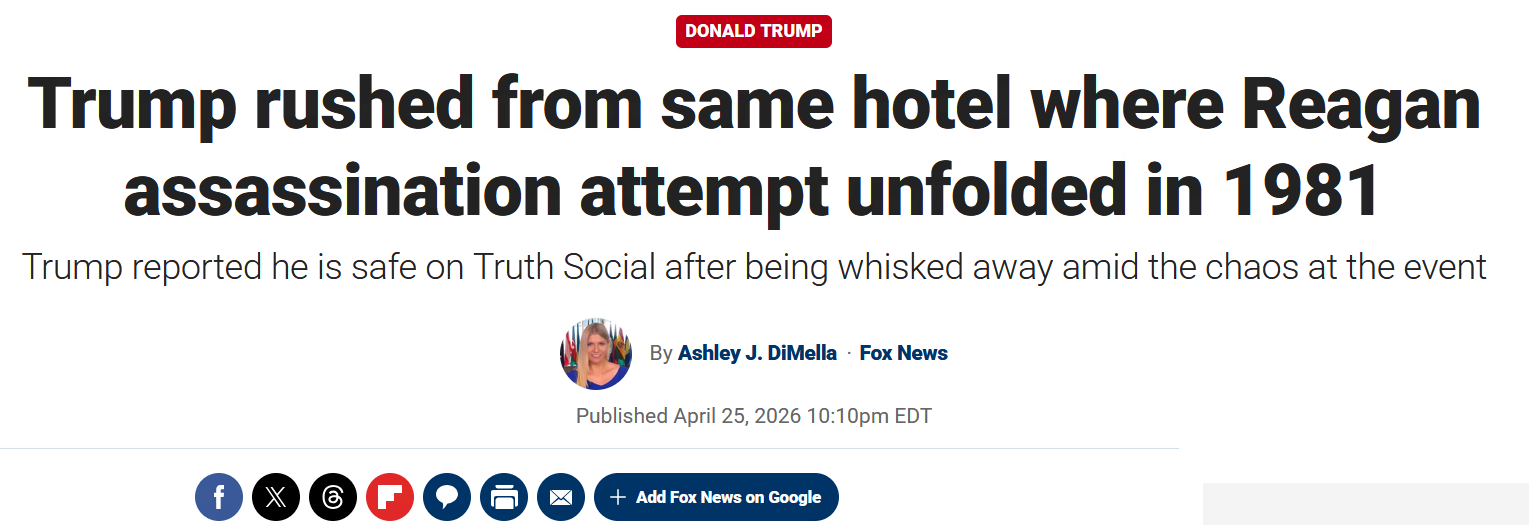 На это совпадение обращает внимание и новостной сайт Fox News. Как отмечает корреспондент, отель Washington Hilton жители американской столицы прозвали «Хинкли Хилтон» — по имени Джона Хинкли-младшего, чуть не убившего Рейгана.