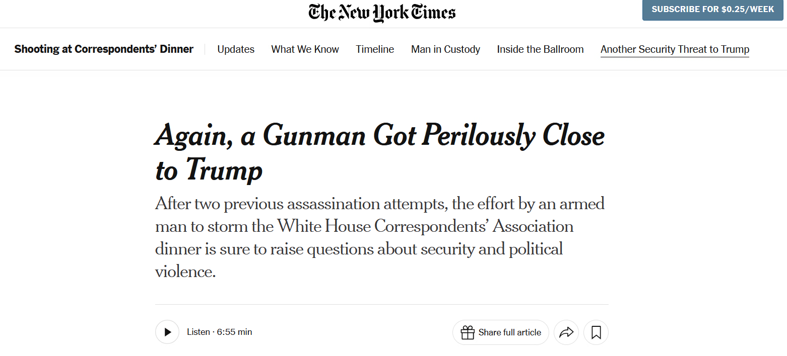 Так, заголовок The New York Times (NYT) гласит: «И снова вооруженный преступник подобрался опасно близко к Трампу». Издание отмечает, что это «уже третий раз за три года, когда Трамп оказался в опасности».