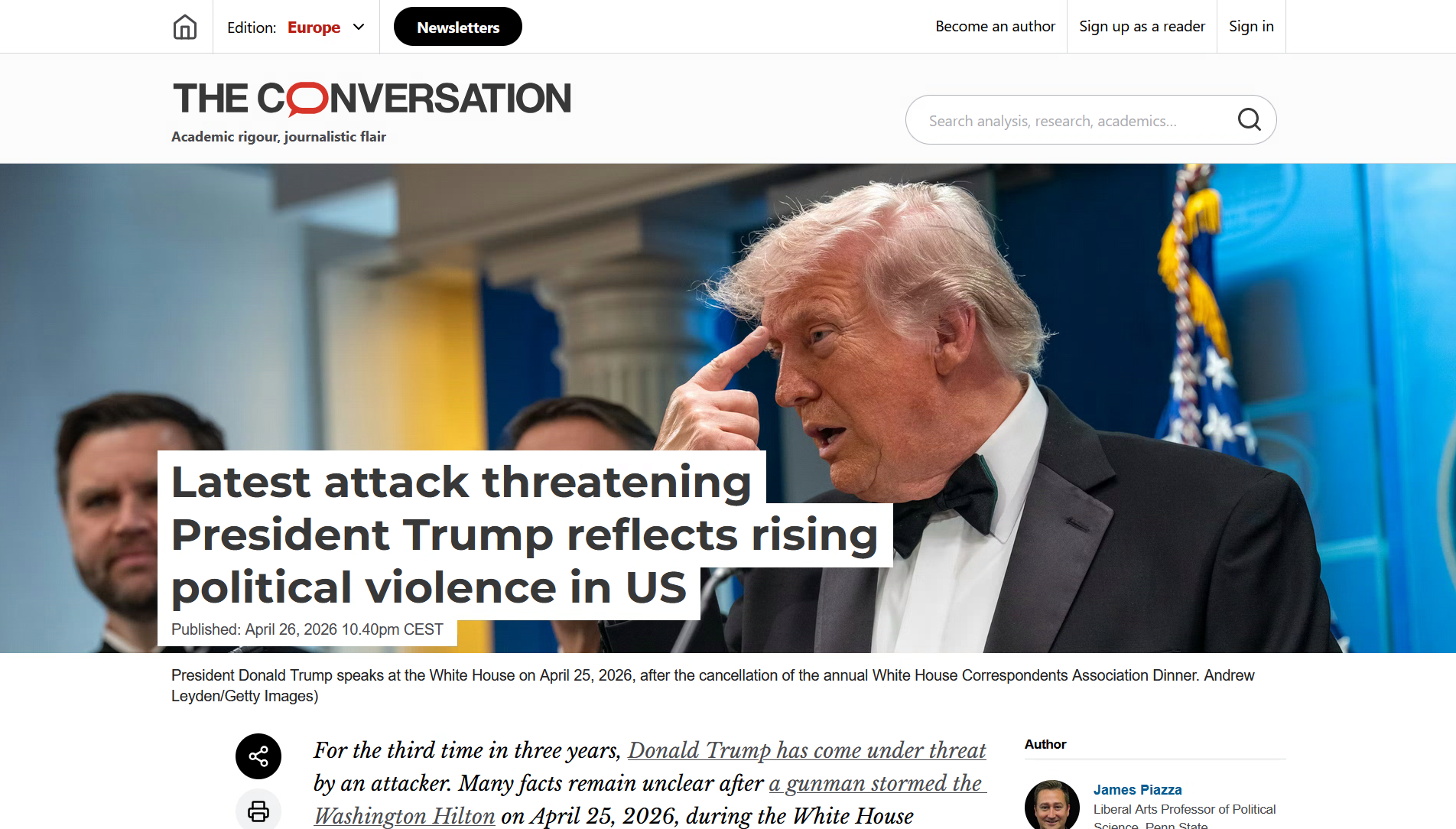 Со своей стороны, The Conversation рассматривает инцидент со стрельбой на ужине Ассоциации корреспондентов Белого дома как часть тревожной тенденции, охватившей Соединённые Штаты. Автор статьи, политолог Джеймс Пьяцца, отмечает, что исследователи «задокументировали рост политического насилия в США в последние годы».